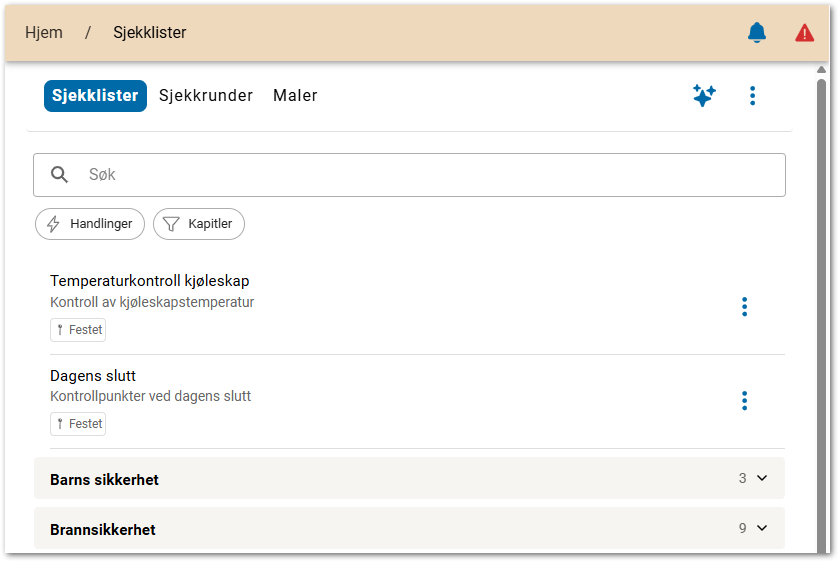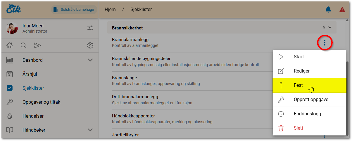 Ved full tilgang til sjekklister kan du feste en sjekkliste øverst på siden. Den vil da vises øverst i menypunktet Sjekklister for alle brukere.