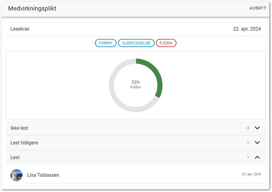 - Her har du oversikt over hvem som har lest, lest tidligere og ikke lest dokumentet. Trykk på de ulike overskriftene for oversikt over personer. Lesedato står til høyre for navnet hvis personen har bekreftet lest.
