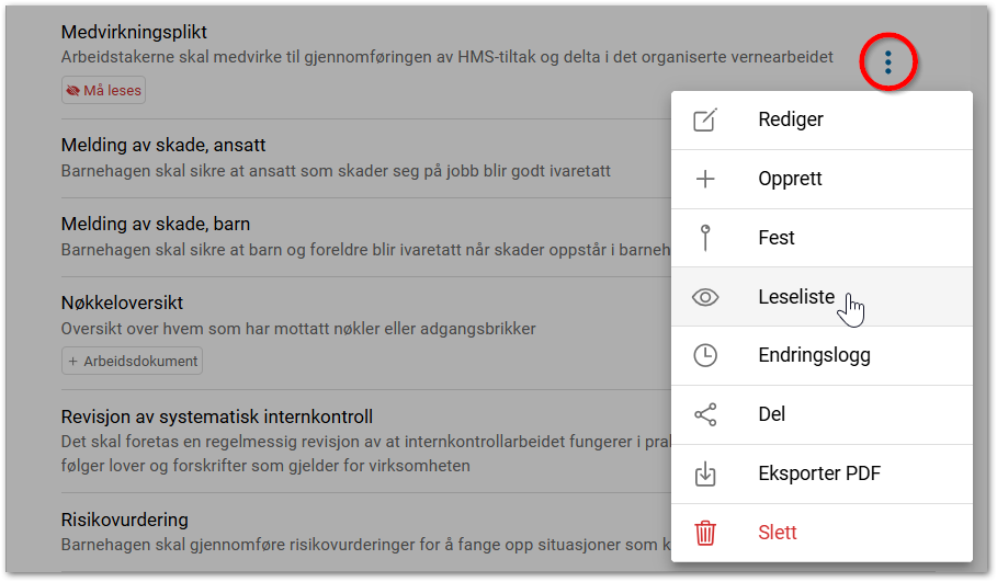 Lukk vinduet. Oversikten viser nå dokumenter som har lesekrav. Trykk på kontekstknappen for leseliste (se bilde 2 over).