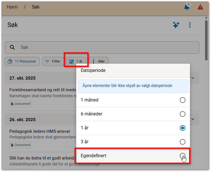 I Eik kan ressurser hentes ut for opptil 3 år. Dersom du ønsker å hente ut behandlede og godkjente ressurser lengre tilbake enn 3 år, kan dette finnes ved å bruke Egendefinert periode. Merk at også egendefinert periode kan hente ut maksimalt 3 år, men denne perioden kan være f.eks. 1.1.2020 - 1.1.2023. Åpne ressurser vil alltid vise i listen.