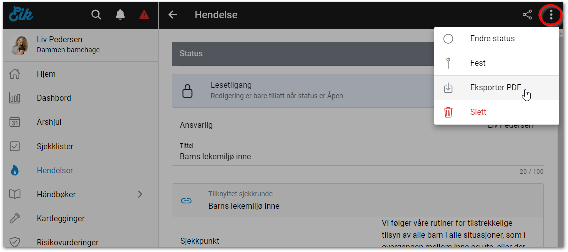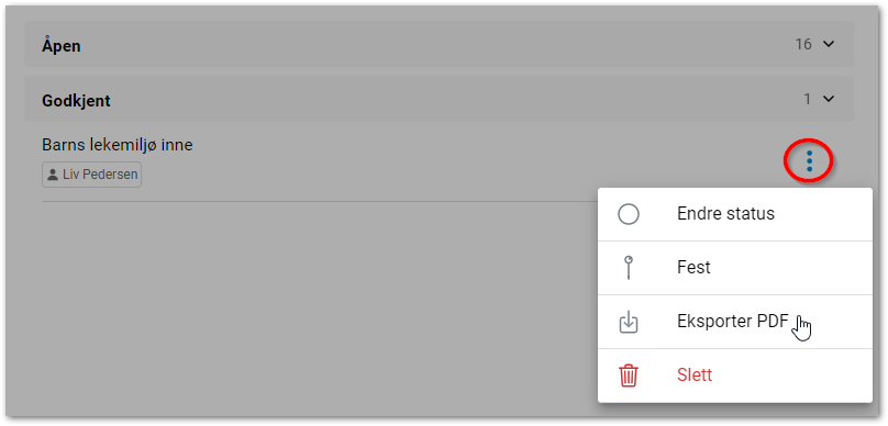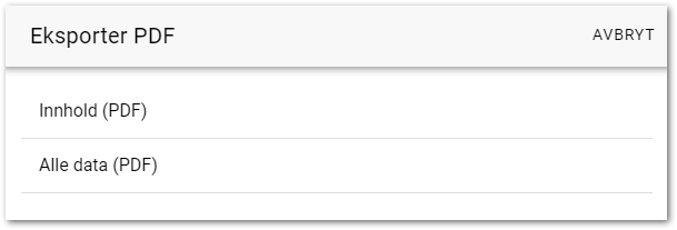 Alternativt: Trykk på kontekstknappen til høyre for ressursen direkte i listen og velg Eksporter PDF. - Velg om kun Innhold eller Alle data skal være med i PDF-eksporten.