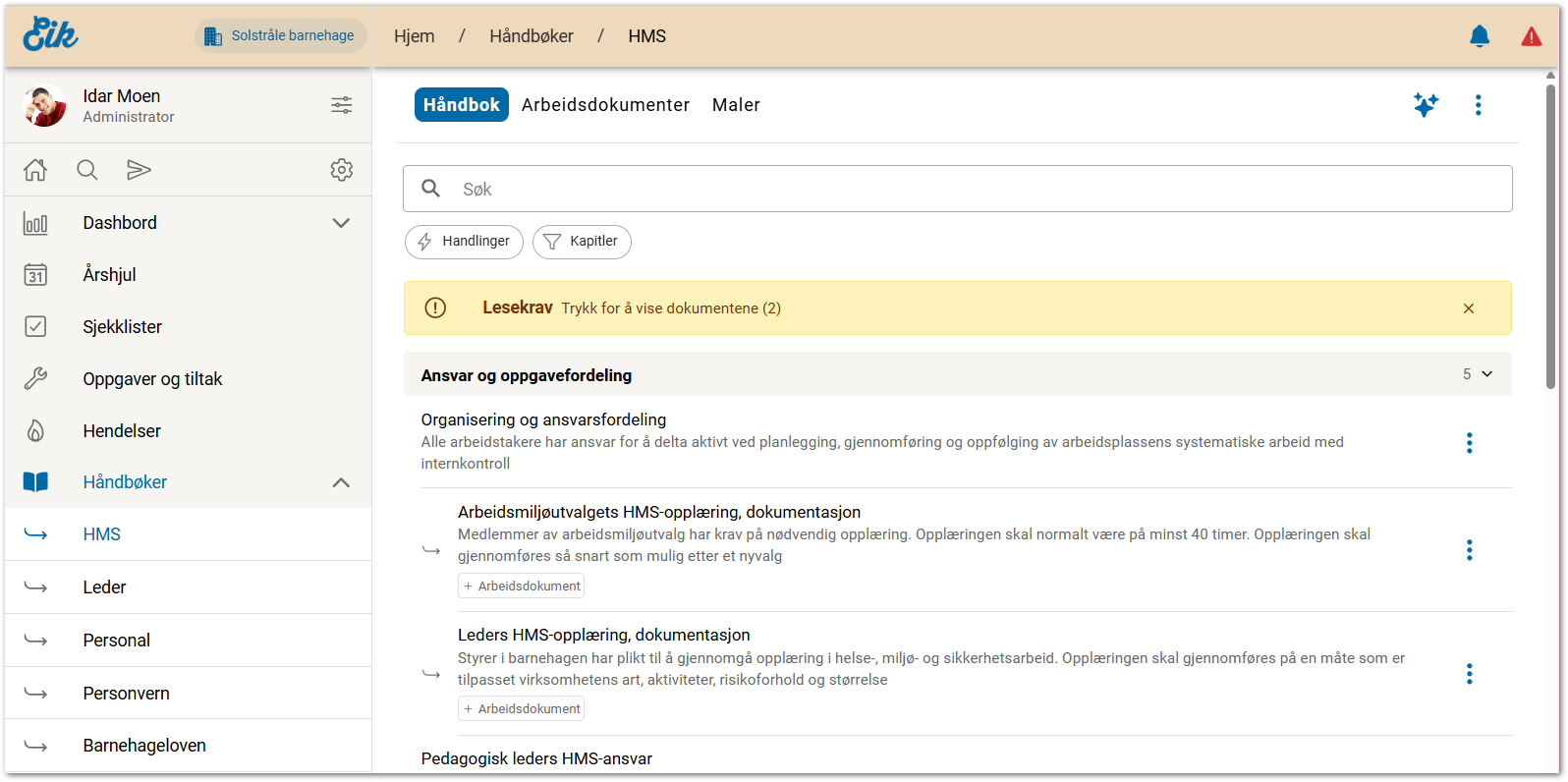 - For barnehager: HMS, personal, leder, personvern og barnehageloven.
