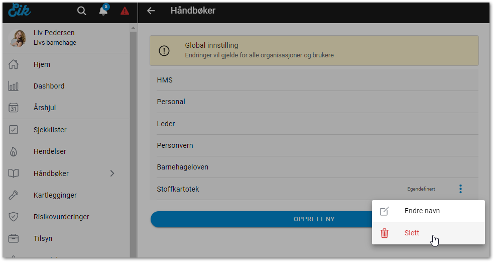 Håndbøker levert av Eik kan ikke slettes. Håndbøker man selv har opprettet, kan slettes.