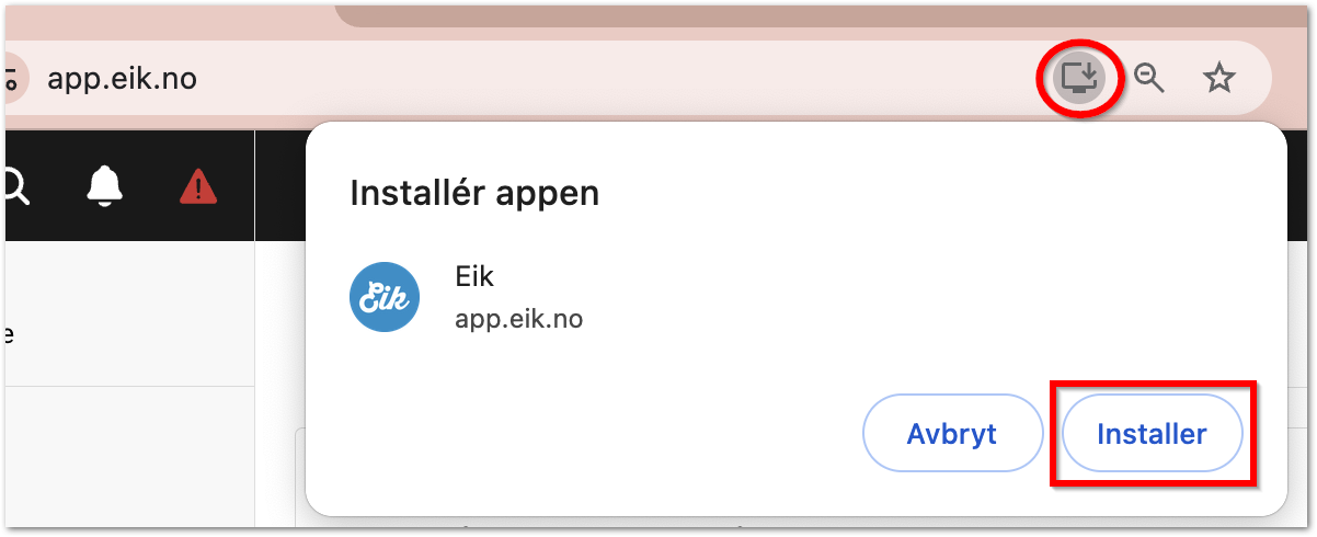 Når man logger inn på app.eik.no, vil man få spørsmål om å legge til Eik som ikon på mobil, nettbrett og PC/mac (nettlesere edge eller chrome). Hvis du ikke får spørsmål når du logger inn i appen, eller har takket nei, kan du legge det til ved å følge denne veilederen.