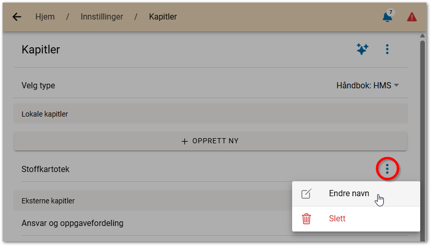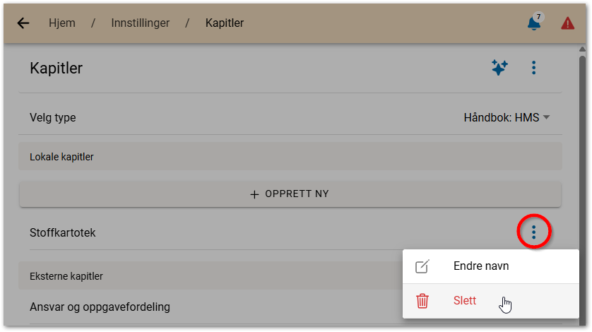 Finn kapitlet du ønsker å slette. Trykk på kontekstknappen bak kapitlet. Du kan ikke slette eksterne kapitler. Kapitler uten dokumenter vil ikke vise i håndboken.