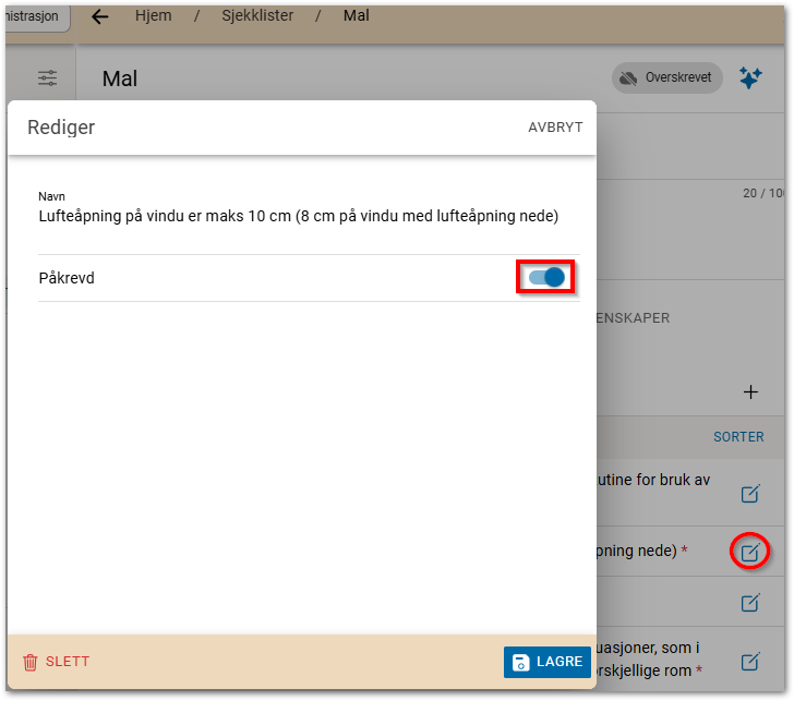 Trykk på redigeringsknappen for punktet, og hak på Påkrevd, og deretter Lagre, på de punkter dette skal gjelde.