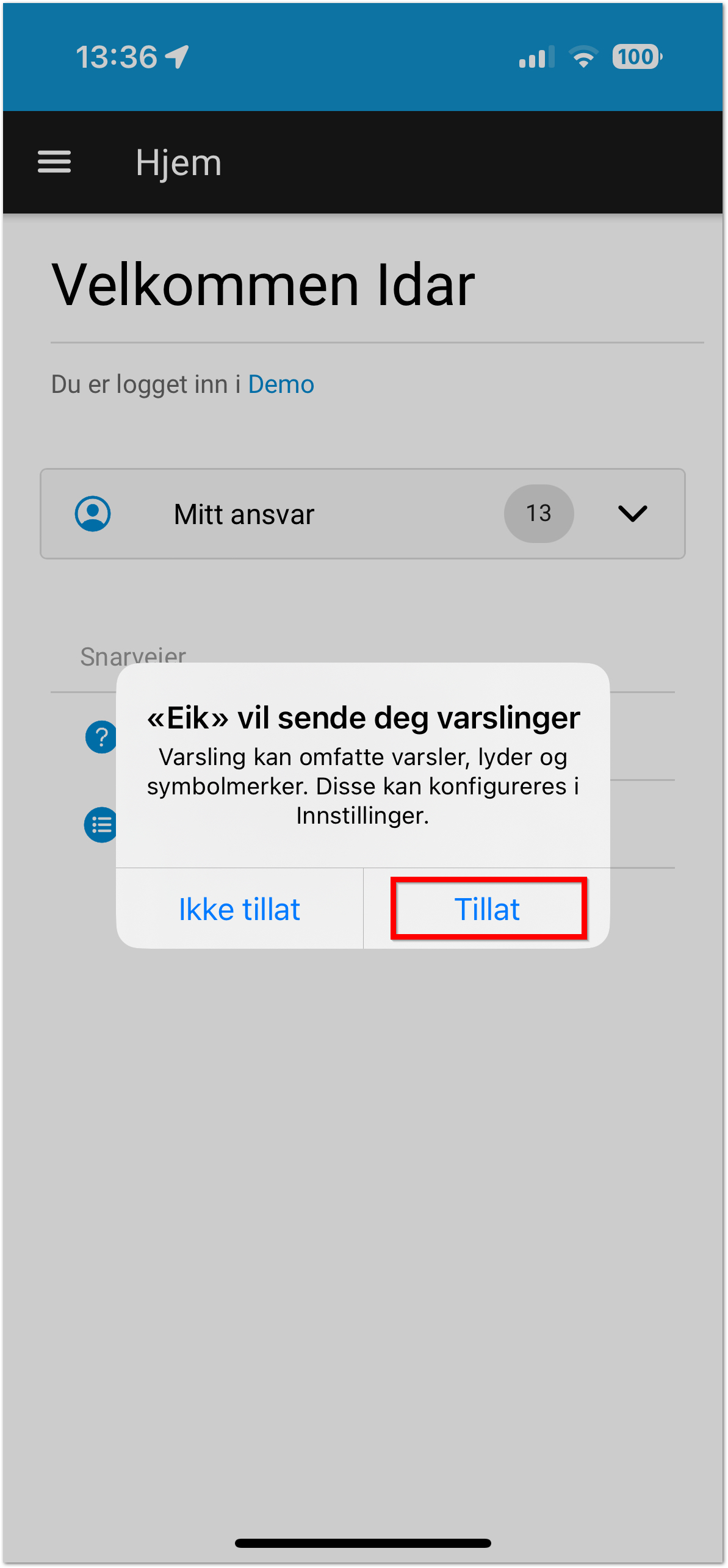 Ved innstallering av Eik, vil du få spørsmål om å tillate varsler. Trykk på Tillat for å få varsler fra Eik.