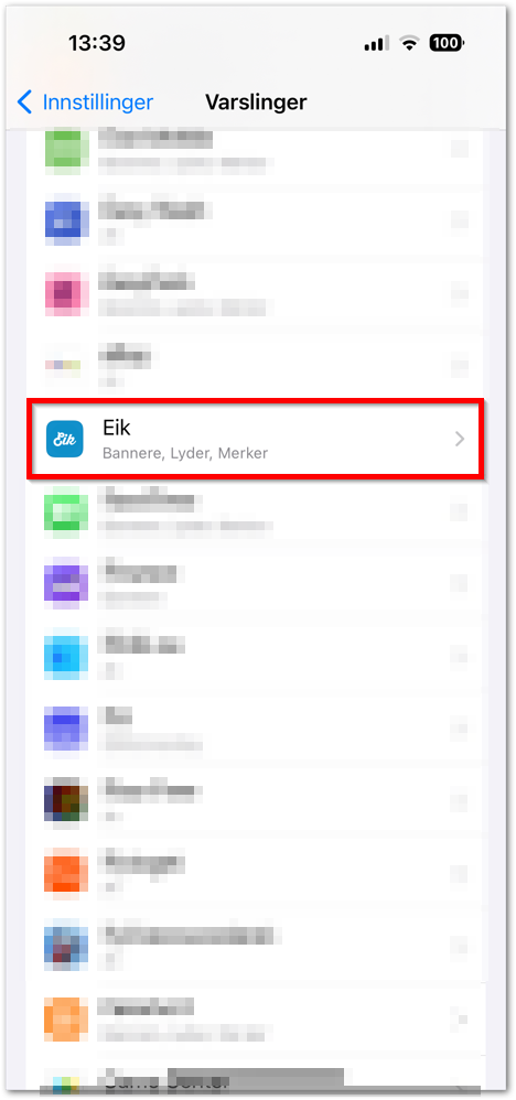 - Gå til telefonens innstillinger og trykk på Varslinger. Finn Eik i listen.