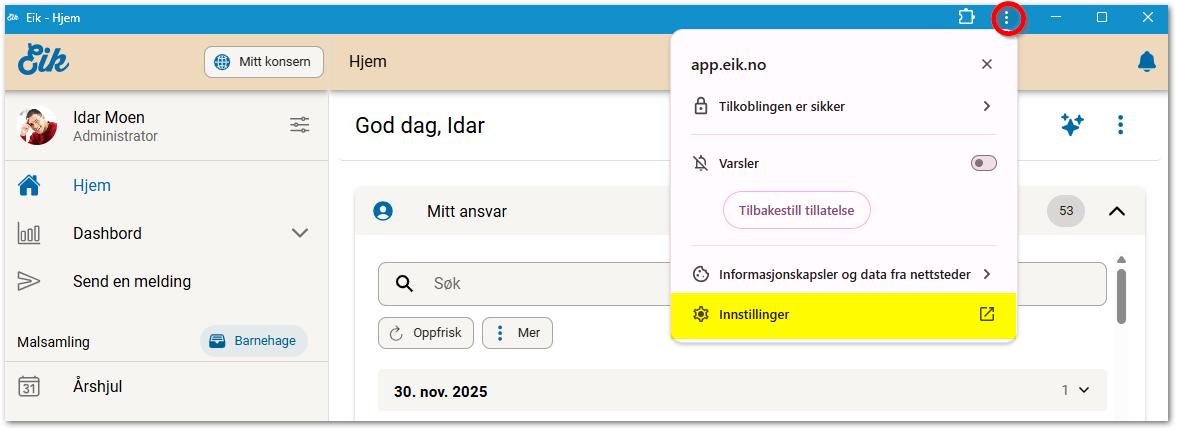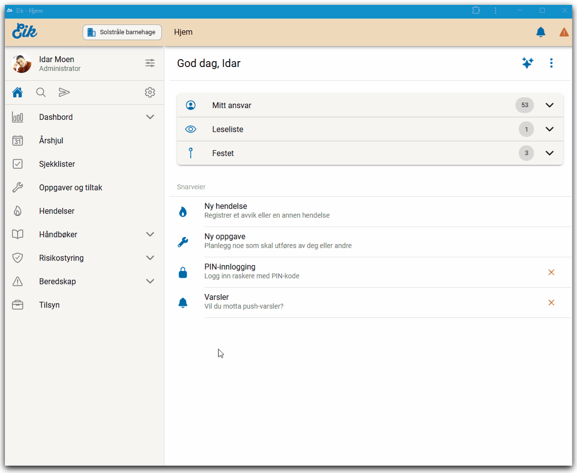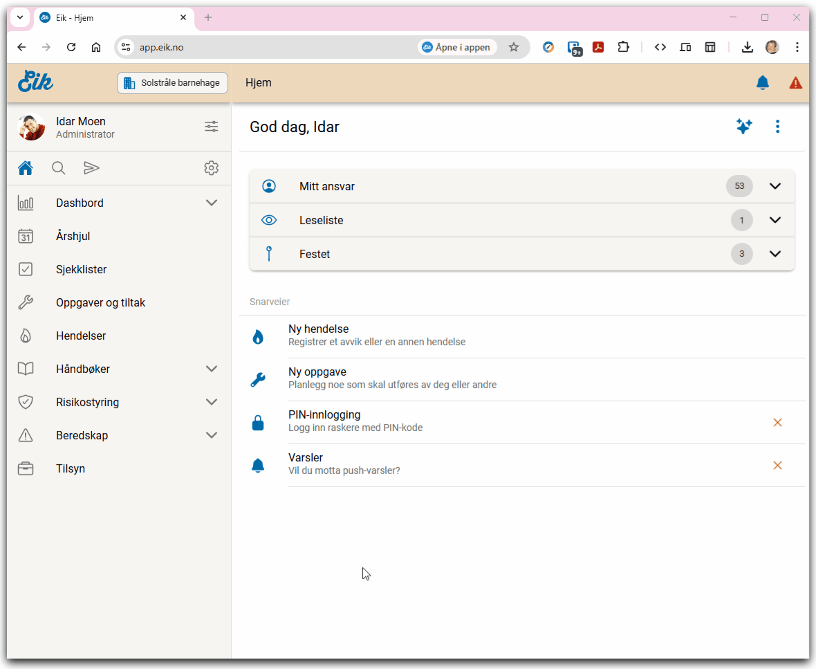 I Eik kan du få push-varsler både på mobil/nettbrett og PC. Du må tillate varsler i nettleser / nedlastet app for å få varsler. Du kan tilpasse hva man får varsler på direkte i Eik, mens å slå av eller på varsler, gjøres i app- eller nettleserinnstillinger.