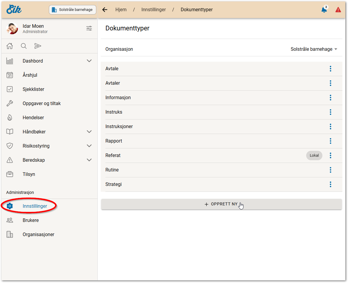 - Trykk på Opprett ny. Skriv inn ønsket navn på dokumenttypen og Bekreft.