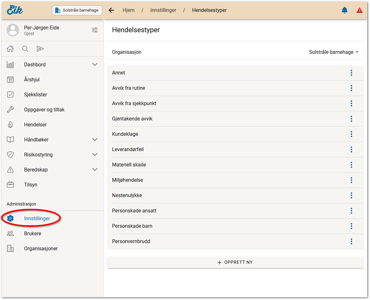 Hendelsestyper er ulike kategorier som brukere registrerer hendelser på. Dette for å kunne skille mellom ulike typer hendelser. Noen systemdefinerte hendelsestyper er låst og kan ikke redigeres.