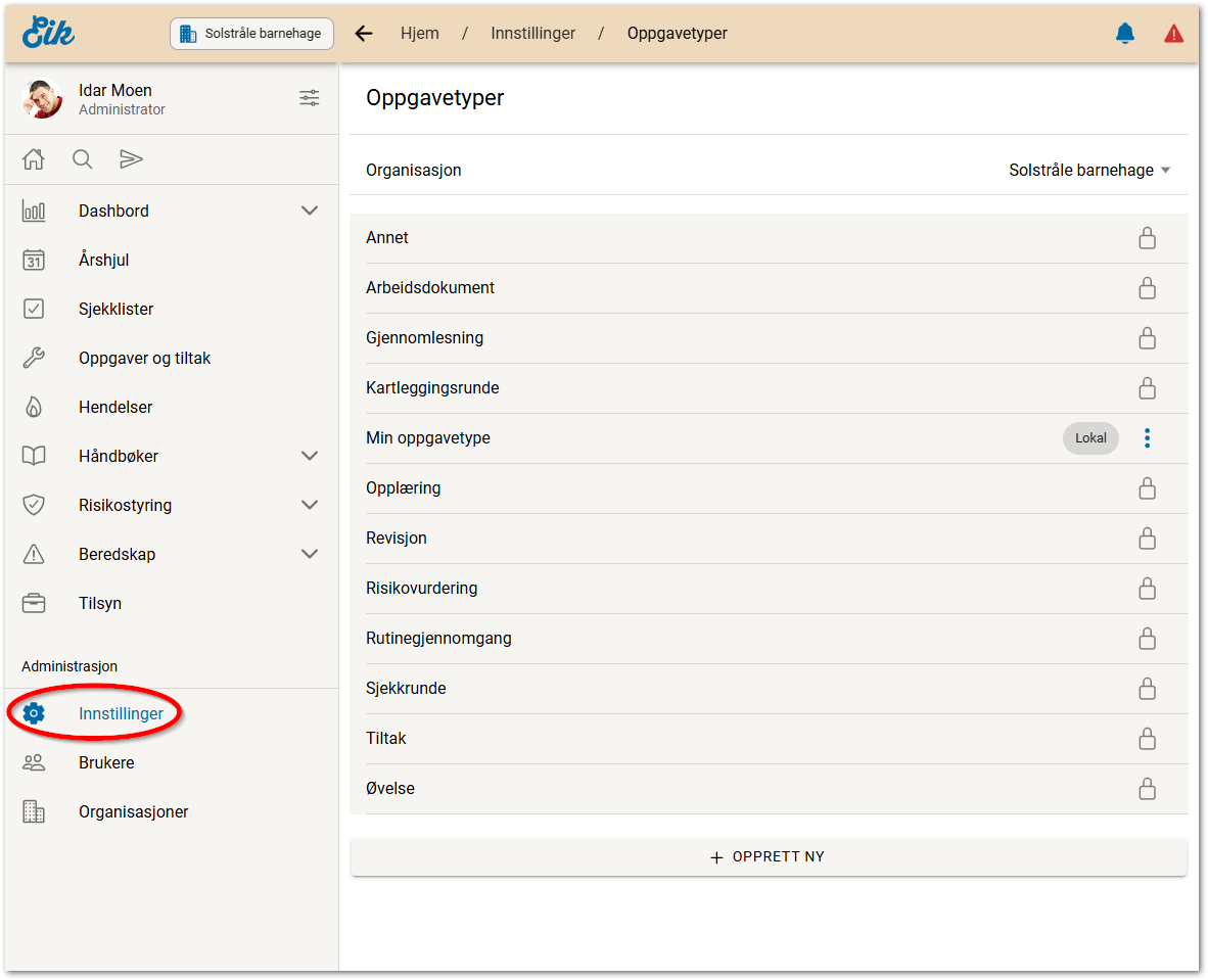 - Trykk på Opprett ny. Skriv inn ønsket navn på oppgavetypen og Bekreft.