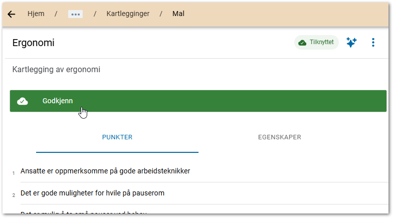 For å godkjenne maler må du ha tilgang til en administrativ organisasjon og ha full tilgang til kartlegginger. En godkjent mal blir godkjent for alle underenheter tilknyttet valgt bransje.