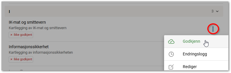 Dersom du ønsker å lese kartleggingsmalen før det godkjennes, trykk på maltittelen for gjennomsyn. Trykk Godkjenn dersom malen skal bli synlig for underenheter i valgt bransje.