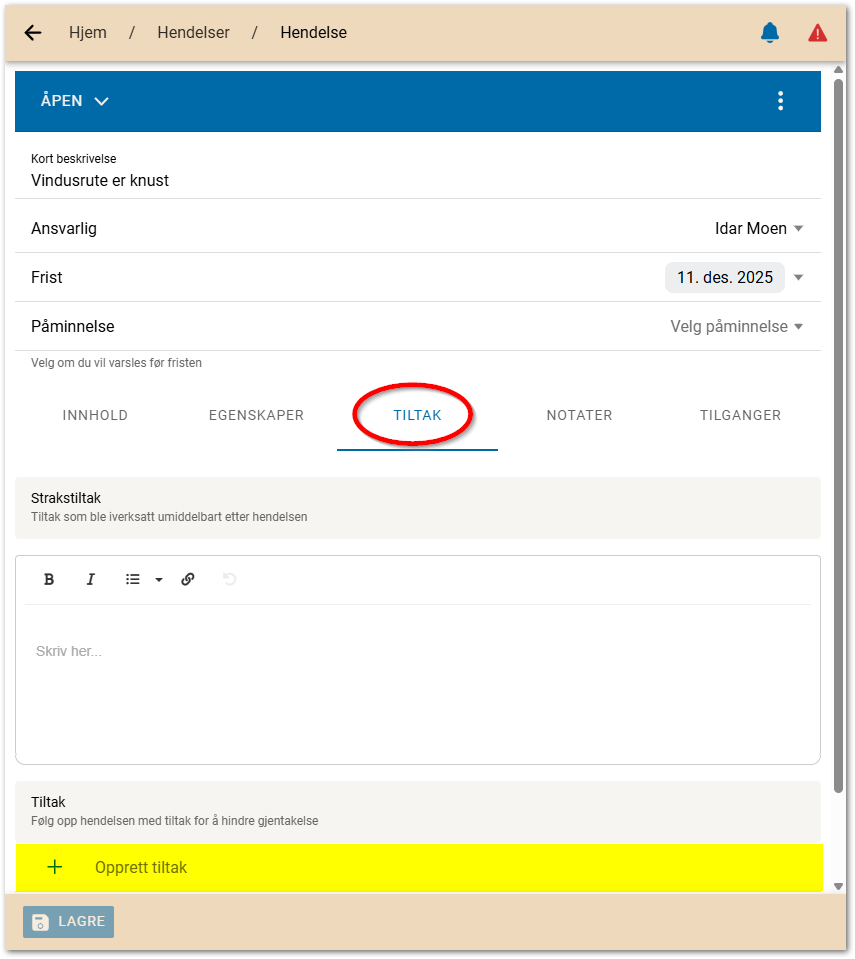 - Trykk på hendelsen eller risikovurderingen som det skal opprettes tiltak i.