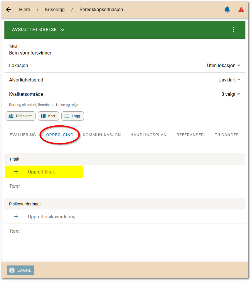 - Trykk på øvelsen eller situasjonen som det skal opprettes tiltak i.