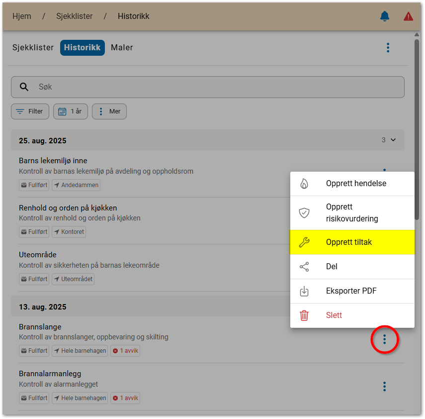- Trykk på kontekstknappen (tre prikker) bak ønsket sjekkrunde/kartleggingsrunde og velg Opprett tiltak.