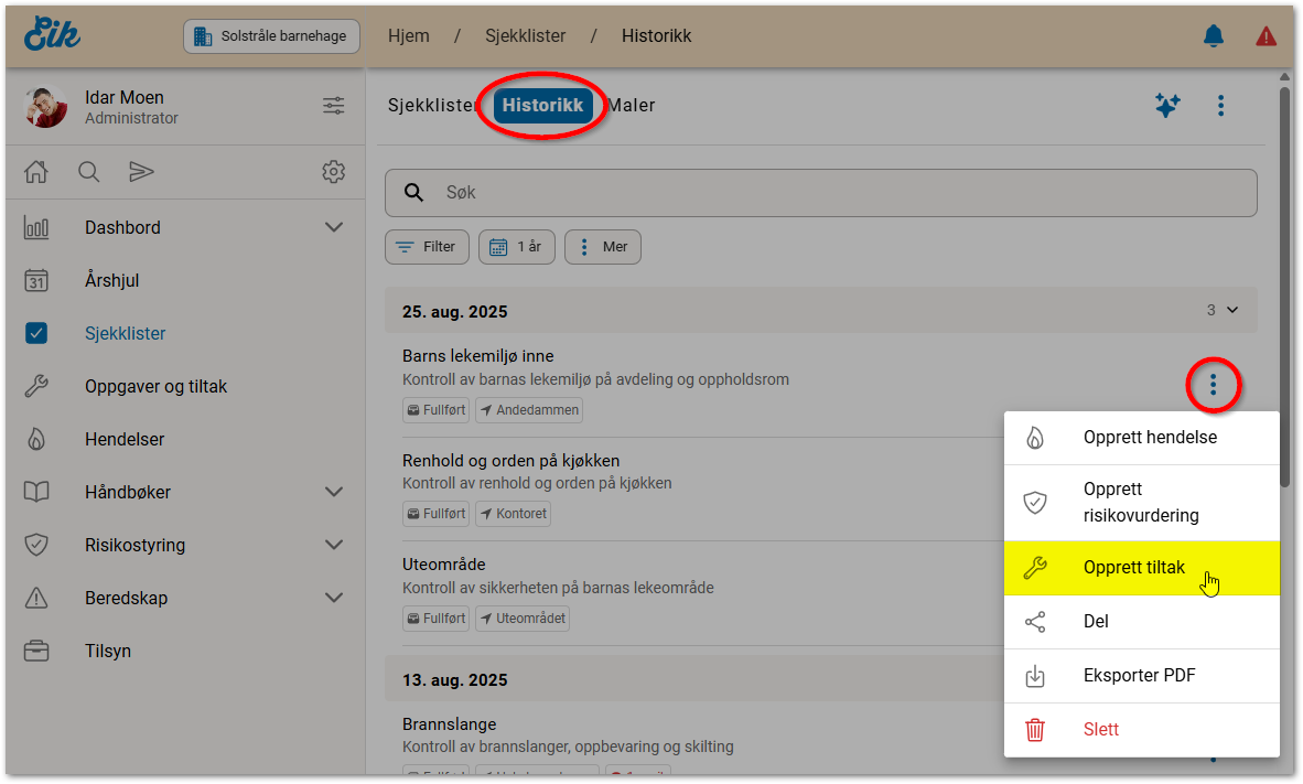 - Trykk på Sjekklister, og velg fanen Historikk.