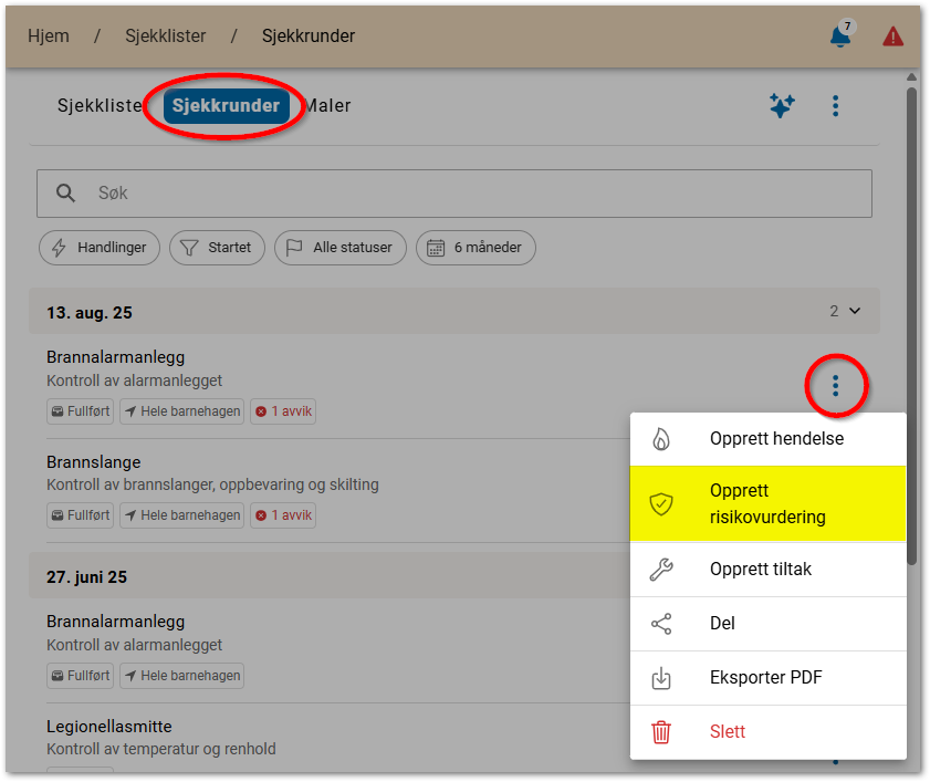 - Trykk på kontekstknappen til høyre for ønsket sjekkliste og velg Opprett risikovurdering. Dette kan kun gjøres med sjekkrunder som er fullført.