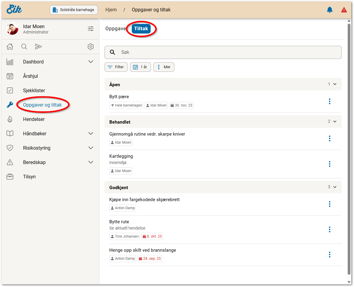 Det kan opprettes tiltak fra en hendelse, risikovurdering, sjekkrunde, kartlegging eller kriselogg. Tiltak skal hindre at uønskede hendelser skal oppstå eller gjentas. Tiltak er altså en endring som skal utføres for å dokumentere at sikkerheten i bedriften heves.
