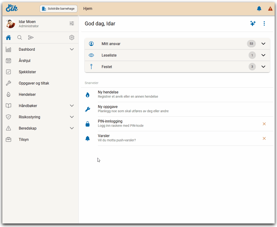 For å kunne benytte Dashbord må en ha full tilgang til Dashbord. Man kan da se rapporter for sin egen og underliggende organisasjoner som man har tilgang til.