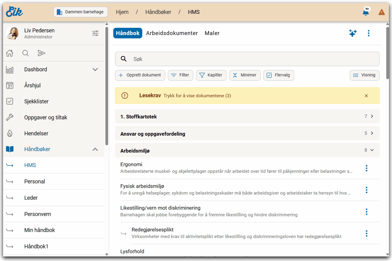 I mange tilfeller kan det være aktuelt å lage en oppgave på å f.eks. gjennomlese eller revidere dokumenter. For å lage en oppgave tilknyttet dokumenter fra en håndbok, kan du følge denne veilederen.