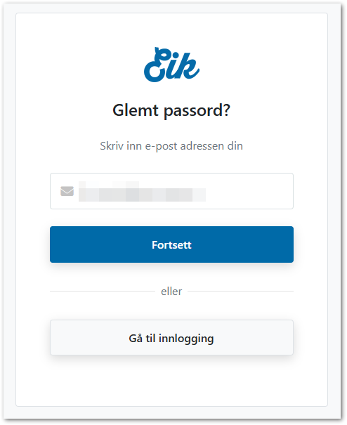 Glemt passord/ bytt passord 07. april 2025 kl. 10.44 Oppdatert Gå til eik.no og trykk på Logg inn. Skriv inn din e-postadresse og trykk på Logg inn. Trykk på Glemt passord? Trykk på Fortsett. Du får da tilsendt en e-post for å tilbakestille passordet. Relaterte artikler Gammel innloggingsløsning Forberedelser til bruk av Eik Informasjonskapsler (cookies) Opprett bruker(e) Oppgaver i årshjul