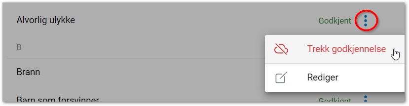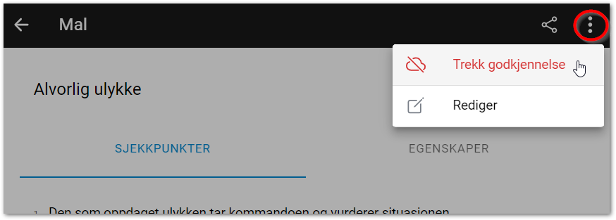 Trykk på kontekstknappen til venstre for beredskapsplanen. Trykk på Trekk godkjennelse dersom malen ikke lenger skal være synlig for underenheter med tilgang til valgt malsamling.