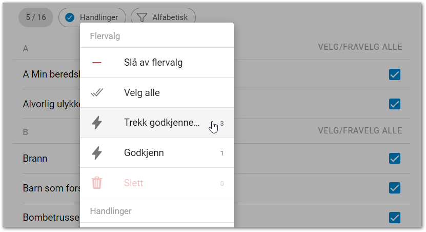 Trykk på Handlinger og Slå på flervalg. Hak på beredskapsplanene som skal bli synlig for underenheter med tilgang til valgt malsamling. Trykk på Handlinger og Godkjenn.