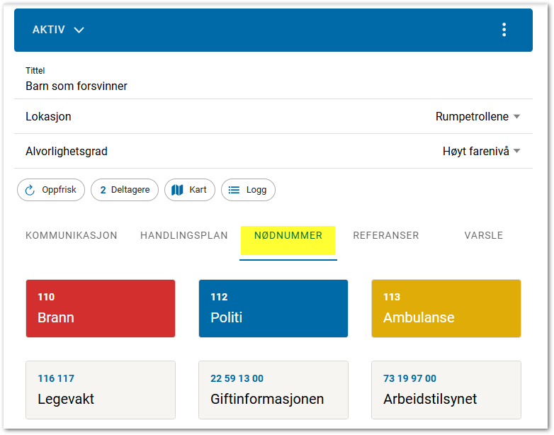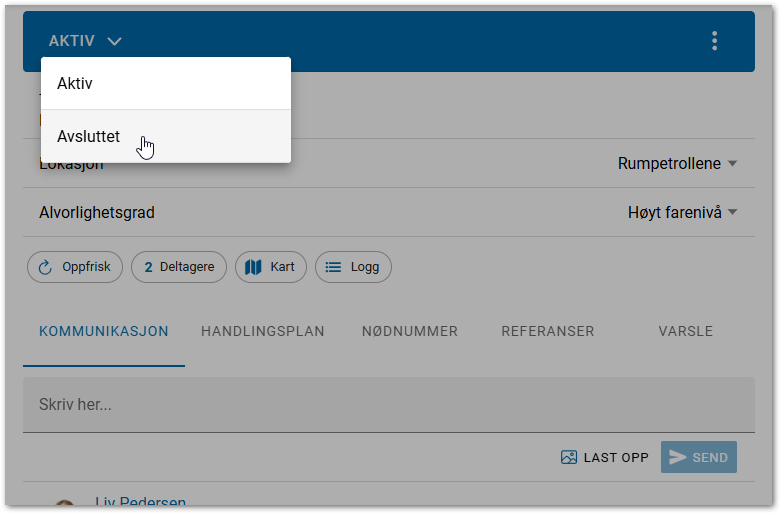 Under fanen Kommunikasjon viser kommunikasjon i situasjonen. Alle registreringer er live data og oppdateres hos alle med tilgang. Det kan også legges til Lokasjon og Alvorlighetsgrad.