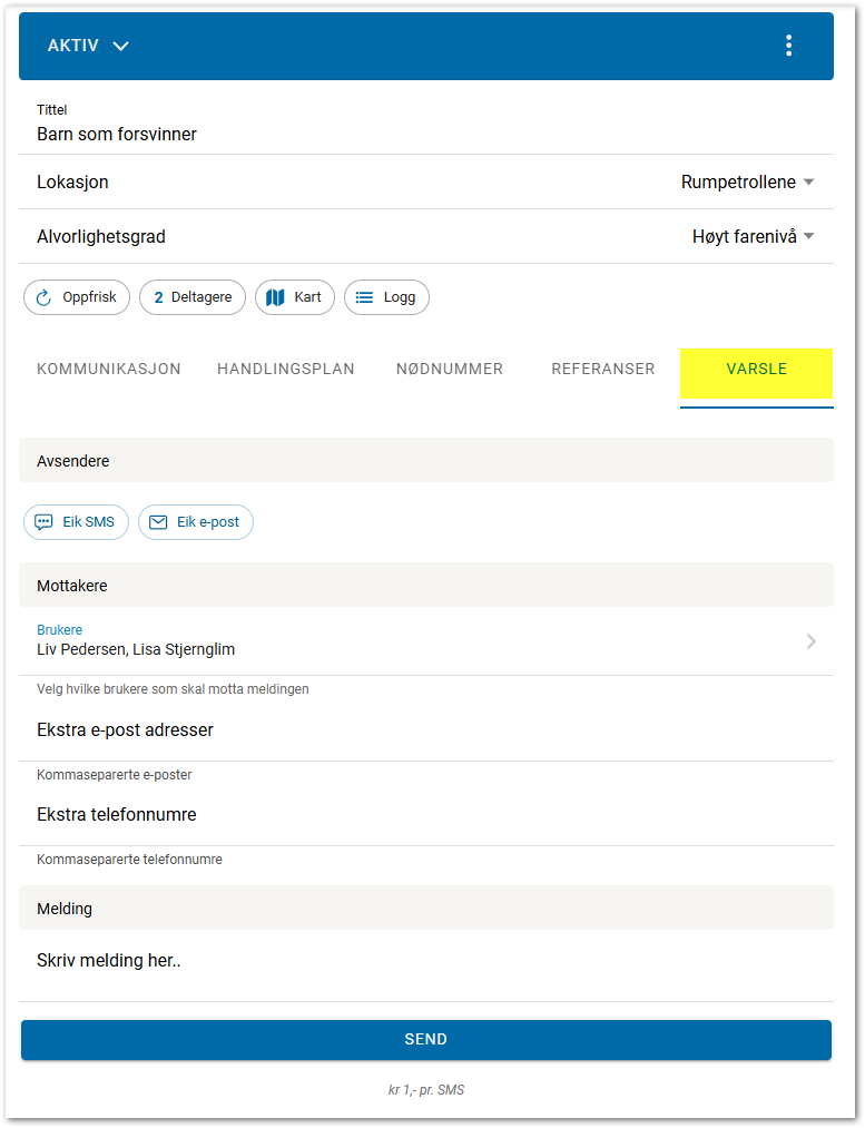 Varsle brukes dersom en har behov for å varsle utover den automatiske varslingen som er satt. Her kan du skrive inn mottakere manuelt, eller trykke på Personer og hente opp registrerte mottakere. Skriv inn melding og trykk på Send.