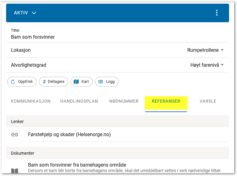 Referanser viser lenker og dokumenter tilknyttet beredskapssituasjonen. For å se dokumenter må brukeren ha tilgang til dem.
