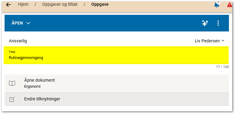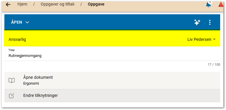 Dersom en bruker blir tildelt en oppgave, vil den dukke opp i brukerens oversikt og vedkommende vil få et varsel om å ha blitt tildelt en oppgave. For å redigere en oppgave, må du ha full tilgang til oppgaven eller stå som ansvarlig.