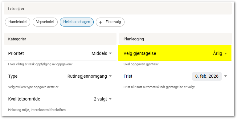 Dersom en oppgave skal gjentas, f.eks. ukentlig eller annenhver måned, så kan det settes opp at oppgaven skal gjentas.