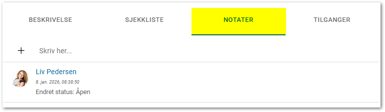 NotaterAlle som har tilgang til oppgaven har mulighet til å skrive et notat og se alle notater i oppgaven. For å legge til et notat, skriv inn i feltet "Skriv her" og trykk på pilen for å lagre.