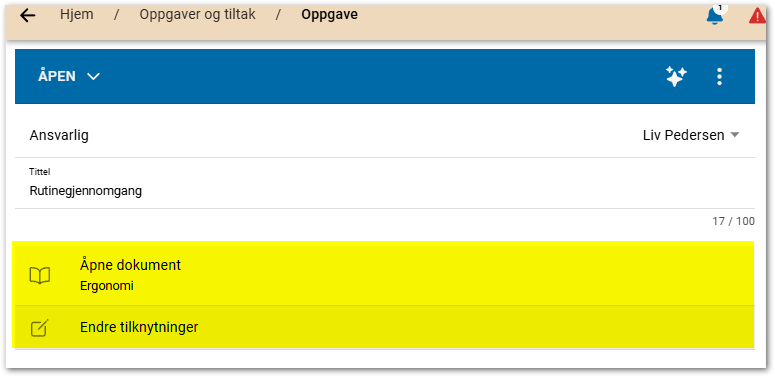 Oppgaven kan tilknyttes sjekkrunder, beredskapsøvelse kartlegging, risikovurdering, dokumenter og/eller arbeidsdokumenter. Du kan navigere direkte fra en oppgave til tilknyttede ressurser.