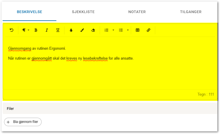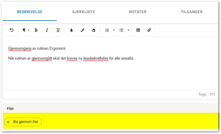 Last opp filer ved behov. Filer kan dras inn i feltet, eller trykk for å velge fil(er).