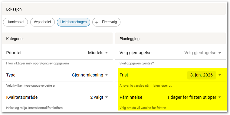Du kan sette en frist for å behandle oppgaven. Når fristen er utløpt vil ansvarlig varsles og datoen blir markert med rødt.