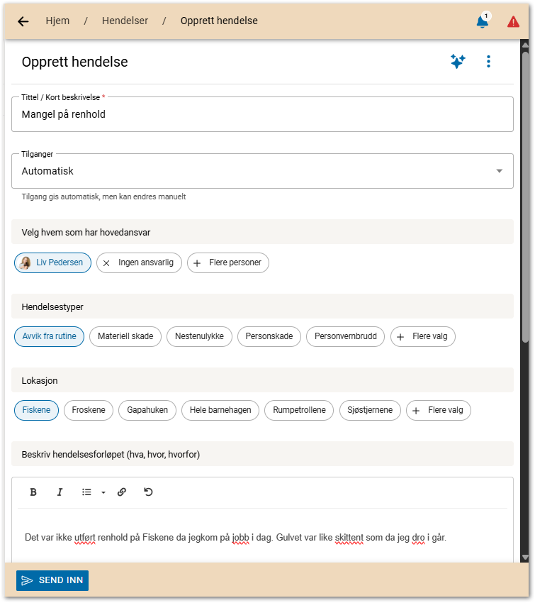 - Ansvarlig: Velg hvem som har hovedansvaret for hendelsen.