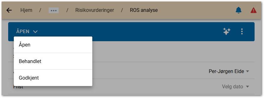 Status: Når risikovurderingen er ferdig behandlet kan en bruker med skrivetilgang til denne risikovurderingen og begrenset tilgang til risikovurderinger generelt endre status fra Åpen til Behandlet. Bruker med full tilgang til risikovurderinger kan Godkjenne, eventuelt gjenåpne risikovurderingen.
