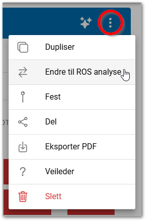 Vurder sannsynlighet og konsekvens på den enkle risikovurderingen. Dersom du trenger å vurdere flere punkter, kan du gå på kontekstknappen oppe i høyre hjørne og trykke Endre til ROS analyse: