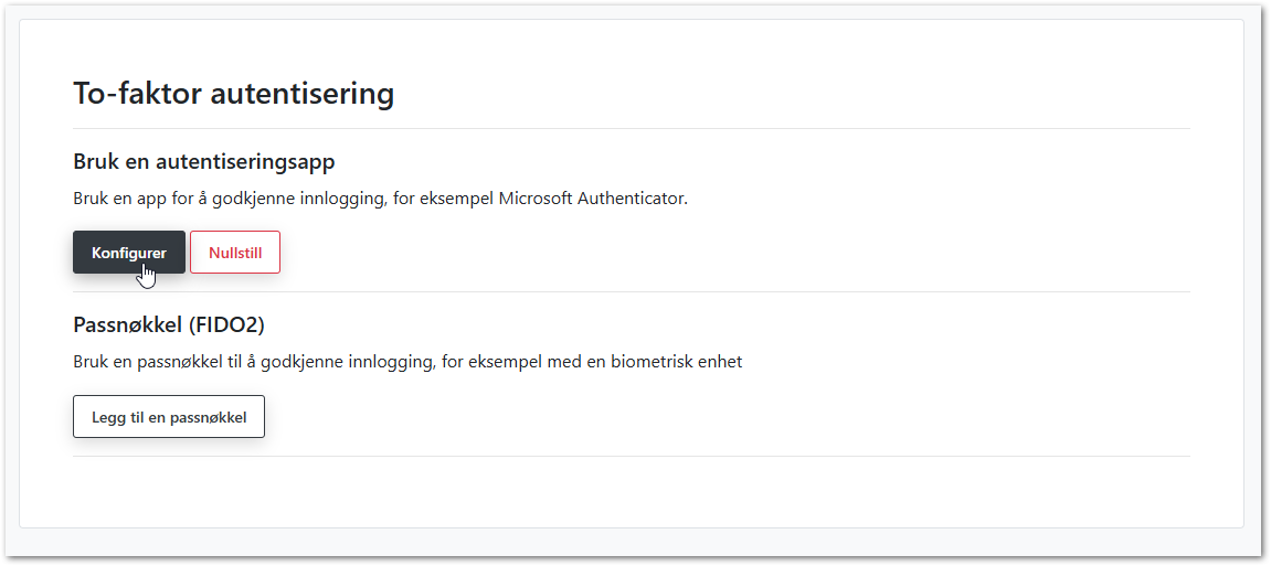 Trykk på Konfigurer under Bruk en autentiseringsapp. Du får deretter opp en QR-kode som kan skannes i appen. Følg deretter veiviser på skjermen.