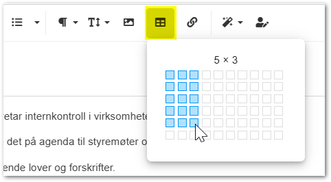 Trykk på ikonet sett inn tabell og velg hvor mange rader og kolonner du ønsker i den nye tabellen: