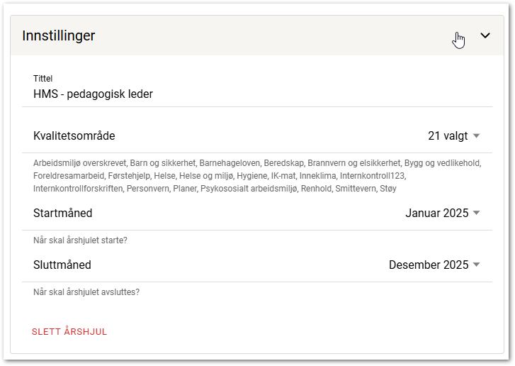 Her kan du endre Tittel på det valgte årshjulet og Kvalitetsområde. Det er også her du kan slette et årshjul. Endringer som gjøres her lagres umiddelbart.